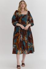 Leaf printed square-neck 3/4 sleeve midi dress featuring smocked detail at back. Lined. Woven. Non-sheer. Lightweight.