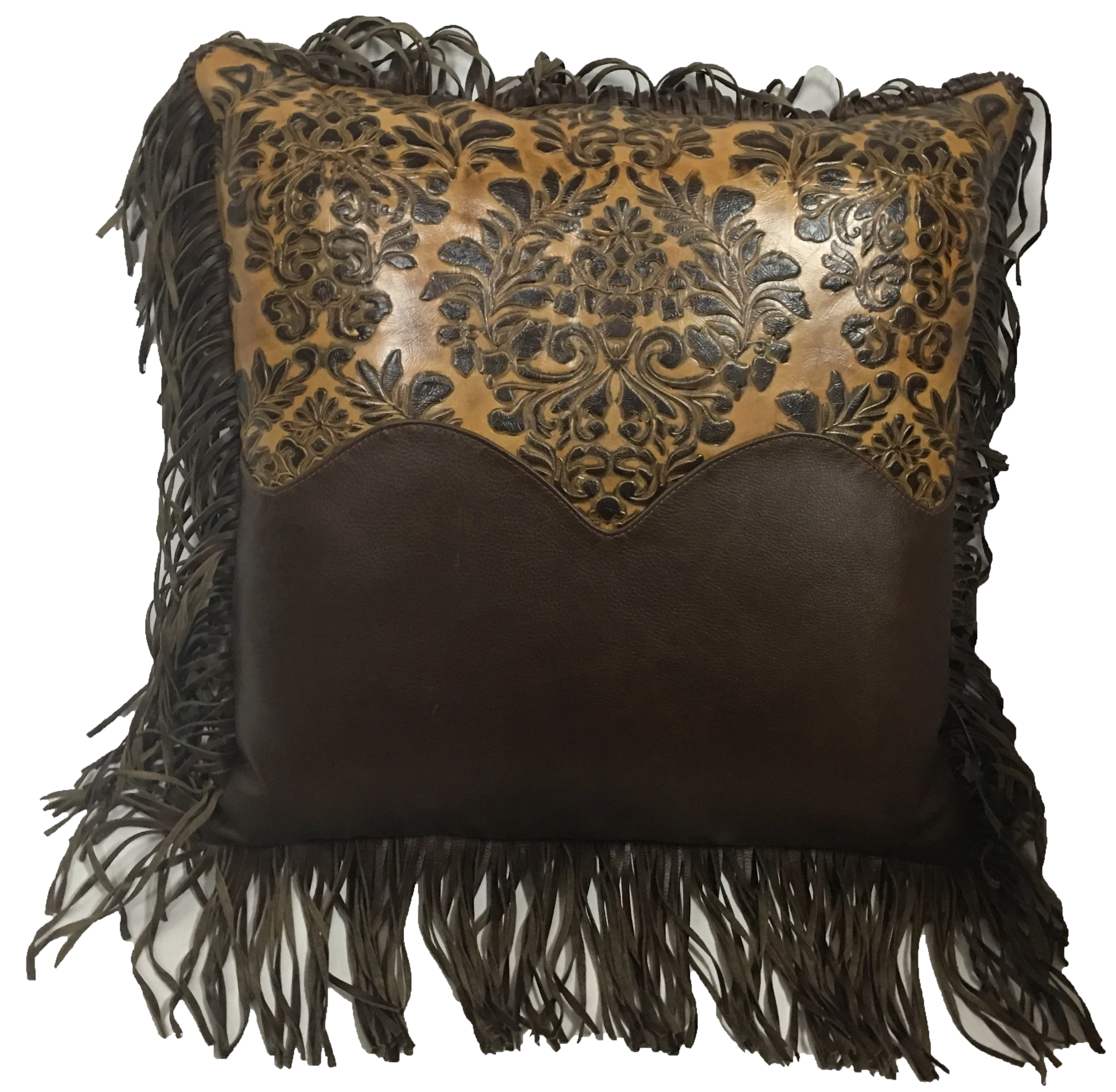 The Ranch Romance Collection pillows bring luxury to the ranch. They feature a western yoke in embossed leather, walnut top grain leather body, and a zipper closure. The boudoir pillow is trimmed with hand twisted leather fringe. 100% USA made by LOREC Ranch. Available sizes: 24x24, 22x22, 20x20, 18x18, & boudoir (12x16). Need a custom size? Call a LOREC Ranch representative for custom details and pricing.