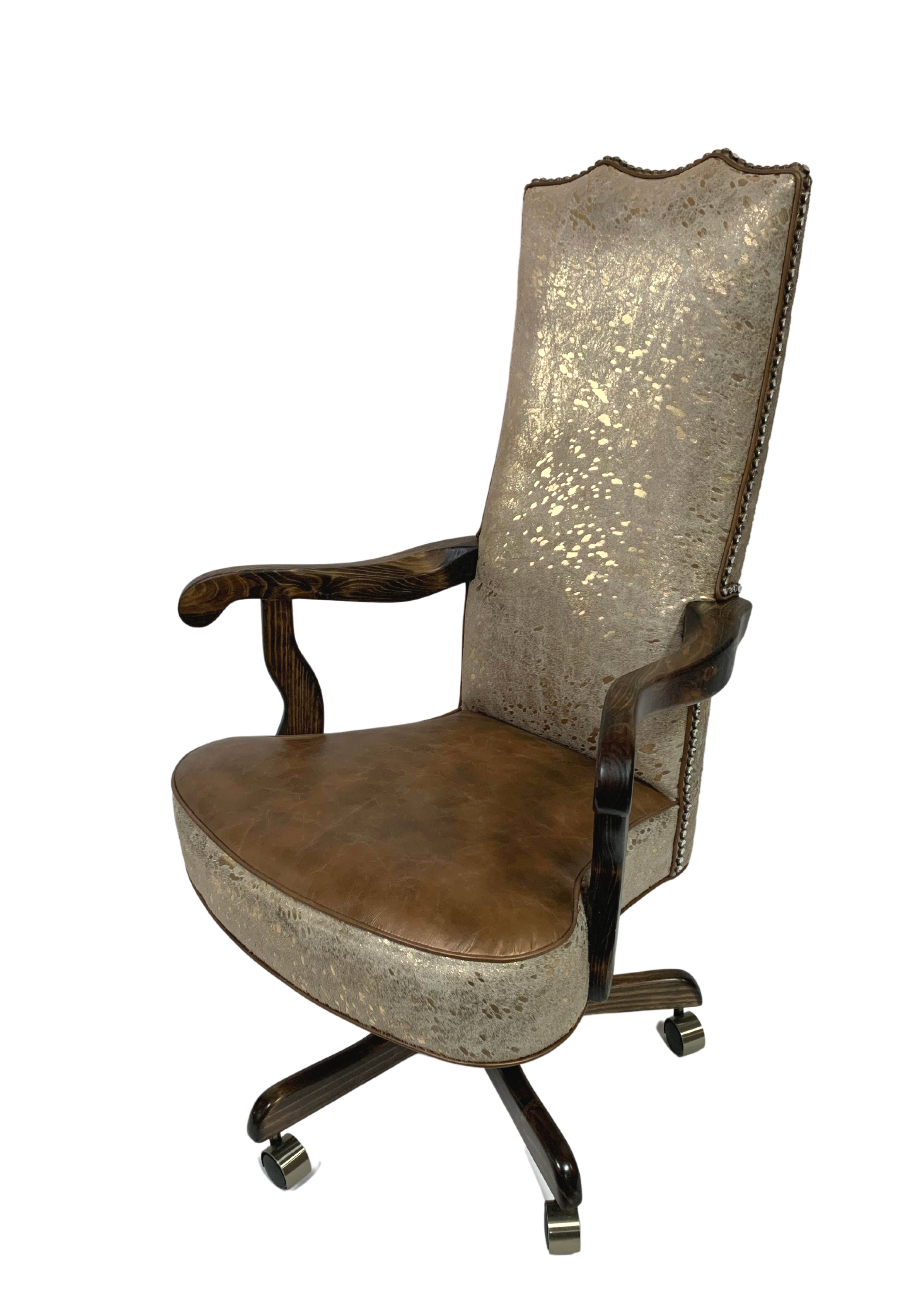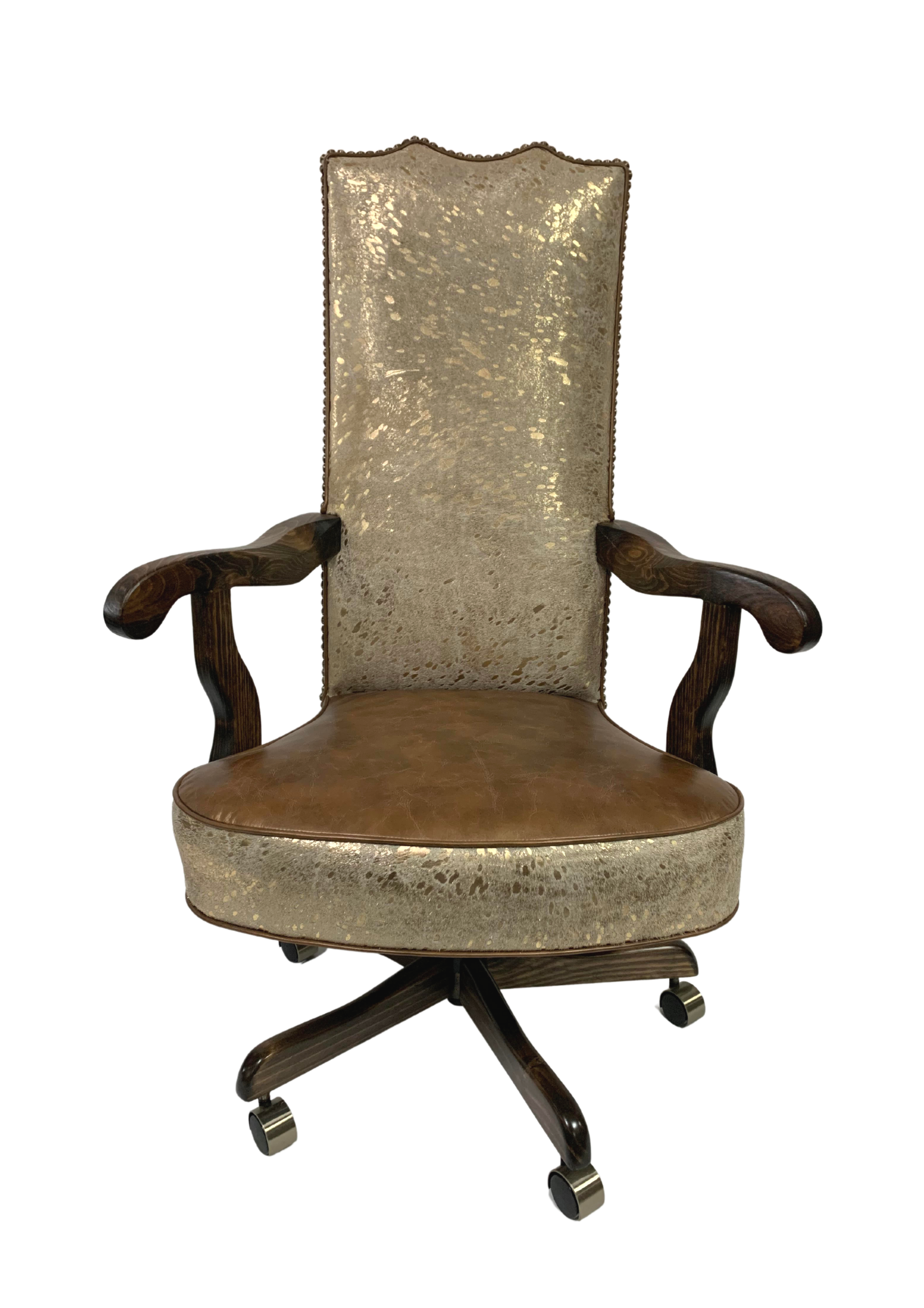 The Rhinestone Cowgirl office chair was designed by one of our good friends. It is handcrafted in the USA by LOREC Ranch and features metallic, acid wash cowhide, a rhinestone nailhead trim, and a honey leather seat. The seat height is adjustable from 19 to 23, and can be set to recline or stay stationary all within our hydraulic Leggett & Platt system. The adjustable arm height at the lowest level measures 27 and at the highest level measures 31-1/2. The Rhinestone Cowgirl office chair is handcrafted in the USA by LOREC Ranch Home Furnishings. Want a different cowhide or leather color? We can do that! Give us a call at (405) 948-0018.
